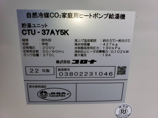 いなべ市北勢町飯倉 コロナエコキュート→自然冷媒CO2家庭用ヒートポンプ給湯機 貯湯ユニットCTU-37AY5K エコキュート交換工事