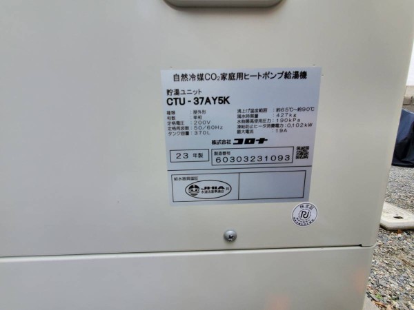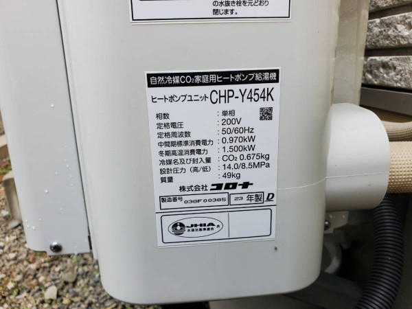 トップページ > 工事事例一覧 > いなべ市北勢町飯倉 コロナ自然冷媒CO2家庭用ヒートポンプ給湯機 貯湯ユニットCTU-37AY5K、ヒートポンプユニットCHP-Y454K エコキュート交換工事