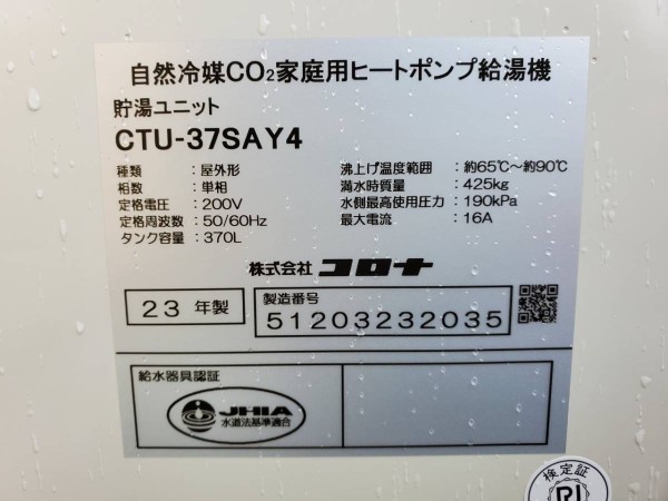 桑名市赤須賀 コロナ自然冷媒CO2家庭用ヒートポンプ給湯機 貯湯ユニットCTU-37SAY4 エコキュート交換工事|三重県のエコキュート専門交換工事店|三重エコキュート交換ショップ補助金対応可能