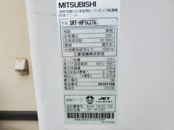 いなべ市北勢町飯倉 三菱電機エコキュートSRT-HPTK37WT→コロナ自然冷媒CO2家庭用ヒートポンプ給湯機貯湯ユニットCTU-37AY5K エコキュート交換工事
