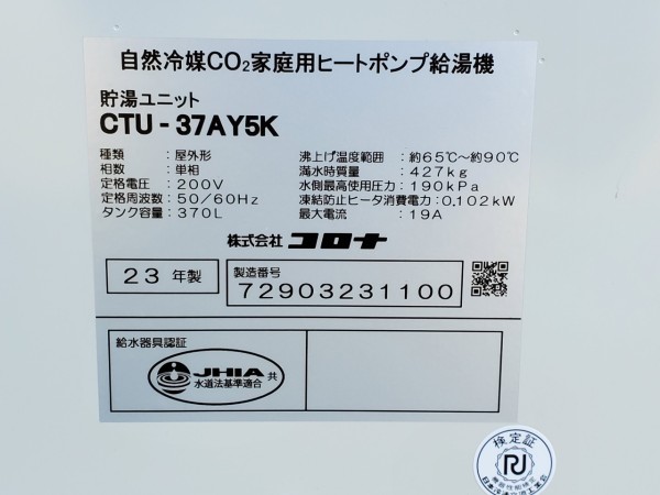 いなべ市北勢町飯倉 コロナ自然冷媒CO2家庭用ヒートポンプ給湯機貯湯ユニットCTU-37AY5K エコキュート交換工事