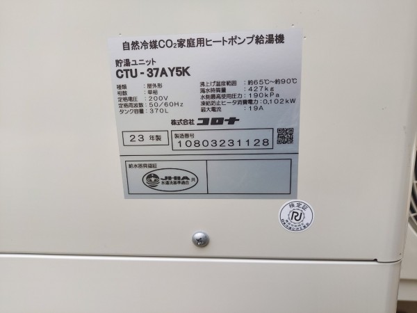 鈴鹿市柳町 コロナ自然冷媒CO2家庭用ヒートポンプ給湯機貯湯ユニットCTU-37AY5K エコキュート交換工事