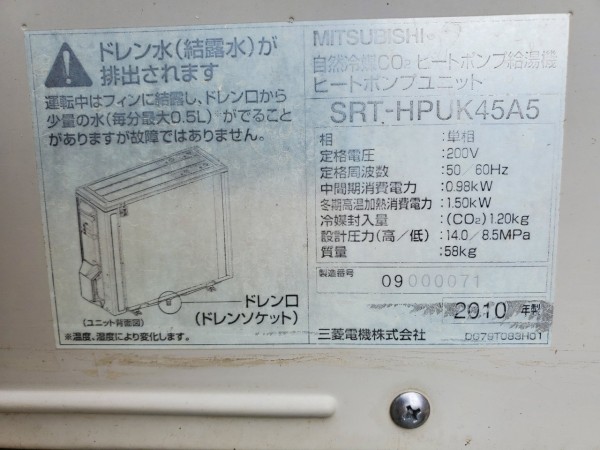 鈴鹿市柳町 三菱電機エコキュートSRT-HPUK45A5→コロナ自然冷媒CO2家庭用ヒートポンプ給湯機ヒートポンプユニットCHP-Y454K エコキュート交換工事