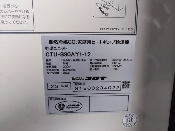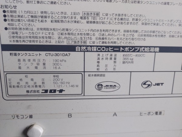 いなべ市北勢町飯倉 コロナ自然冷媒CO2家庭用ヒートポンプ給湯機貯湯タンクユニットCTU-301DA7、貯湯ユニットCTU-S30AY1-12 エコキュート交換工事