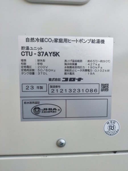 いなべ市員弁町畑新田 コロナ自然冷媒CO2家庭用ヒートポンプ給湯機ヒートポンプユニットCHP-Y454K、貯湯ユニットCTU-37AY5K エコキュート交換工事