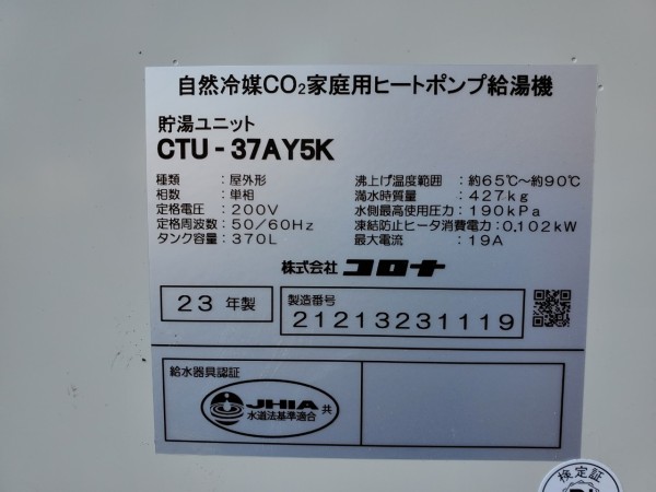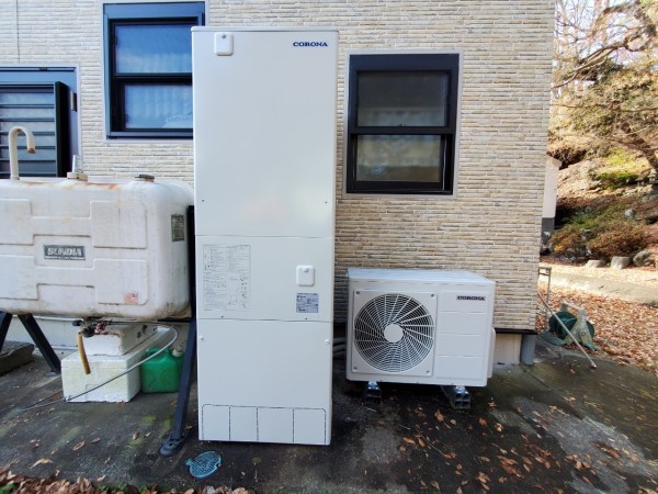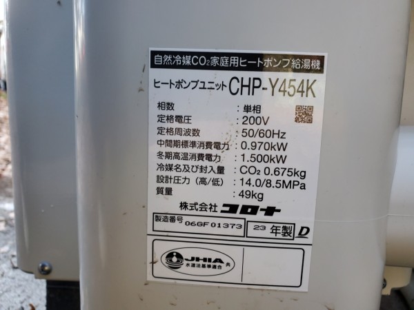 鈴鹿市柳町 コロナ自然冷媒CO2家庭用ヒートポンプ給湯機ヒートポンプユニットCHP-Y454K、貯湯ユニットCTU-37AY5K エコキュート交換工事