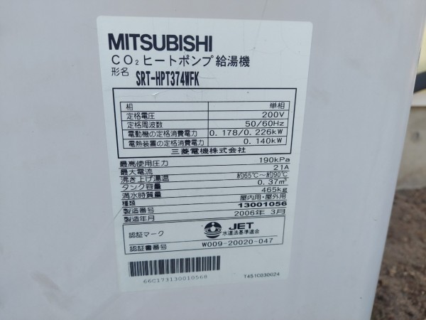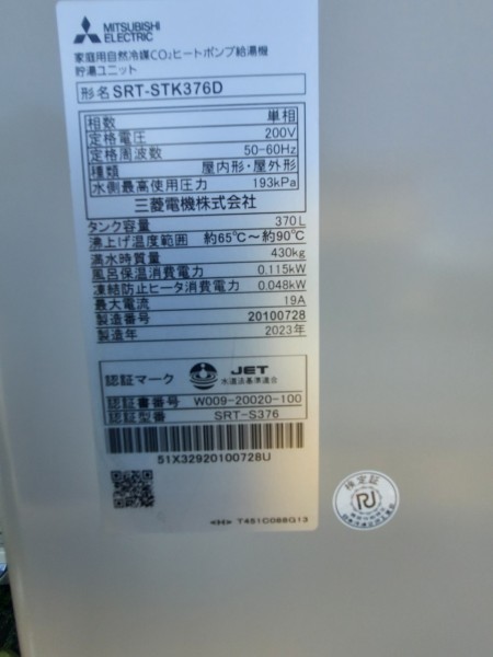 尾鷲市新田町 三菱電機エコキュート→三菱電機自然冷媒CO2家庭用ヒートポンプ給湯機 貯湯ユニットSRT-STK376D エコキュート交換工事