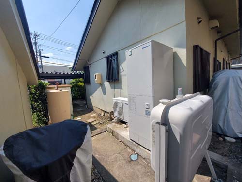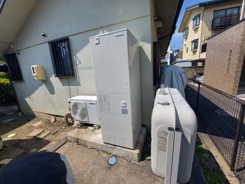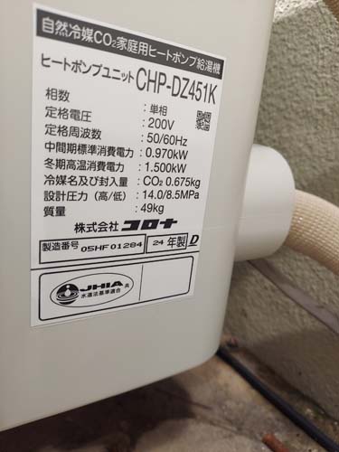 いなべ市員弁町畑新田 コロナ自然冷媒CO2家庭用ヒートポンプ給湯機 貯湯ユニットCTU-37AZ1K、ヒートポンプユニットCHP-DZ451K エコキュート交換工事