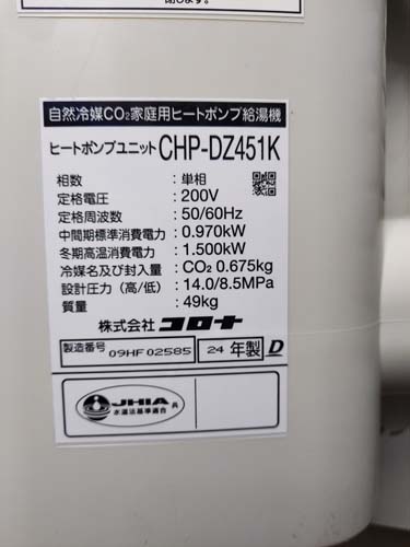 桑名市桑名 コロナ自然冷媒CO2家庭用ヒートポンプ給湯機 ヒートポンプユニットCHP-DZ451K エコキュート交換工事