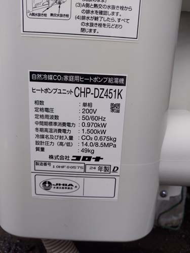 尾鷲市天満浦 コロナエコキュート→コロナ自然冷媒CO2家庭用ヒートポンプ給湯機 ヒートポンプユニットCHP-DZ451K エコキュート交換工事