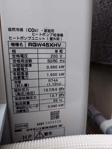 尾鷲市天満浦 コロナ自然冷媒CO2家庭用ヒートポンプ給湯機 ヒートポンプユニットCHP-458K→ダイキン工業自然冷媒CO2家庭用ヒートポンプ給湯機貯湯ユニットTU37XFHV、ヒートポンプユニットRQW45XHV エコキュート交換工事