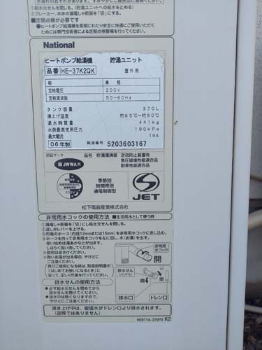尾鷲市桂ヶ丘 Nationalヒートポンプ給湯機貯湯ユニットHE-37K2QK→コロナ自然冷媒CO2家庭用ヒートポンプ給湯機貯湯ユニットCTU-37AZ1K、ヒートポンプユニットCHP-DZ451K エコキュート交換工事