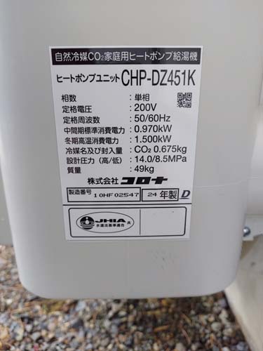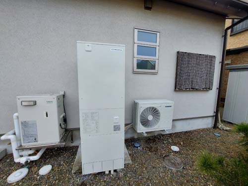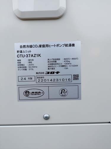 尾鷲市桂ヶ丘 コロナ自然冷媒CO2家庭用ヒートポンプ給湯機貯湯ユニットCTU-37AZ1K、ヒートポンプユニットCHP-DZ451K エコキュート交換工事