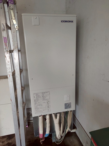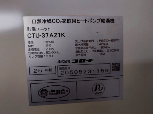 伊賀市依那具 コロナ自然冷媒CO2家庭用ヒートポンプ給湯機貯湯ユニットCTU-37AZ1K、ヒートポンプユニットCHP-DZ451K エコキュート交換工事