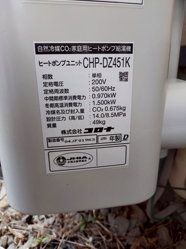 トップページ > 工事事例一覧 > 伊賀市依那具 コロナ自然冷媒CO2家庭用ヒートポンプ給湯機貯湯ユニットCTU-37AZ1K、ヒートポンプユニットCHP-DZ451K エコキュート交換工事